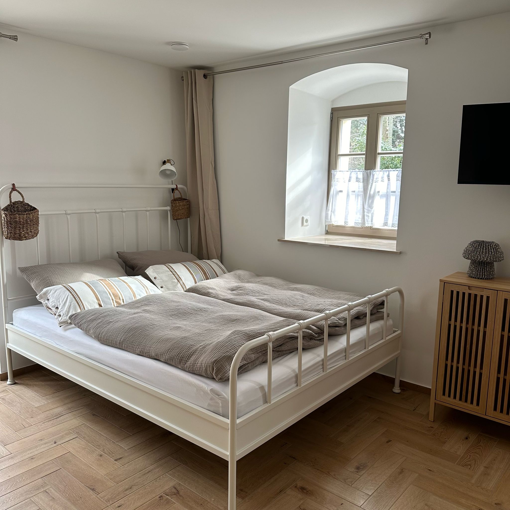 Die Wohnung ist liebevoll eingerichtet und strahlt eine einladende Atmosphäre aus. Der offene Wohnbereich ist mit einem komfortablen Bett, einem kleinen Esstisch und einer Sitzecke ausgestattet, die zum Verweilen einlädt. In der voll ausgestatteten Küche kann nach Herzenslust gekocht werden.